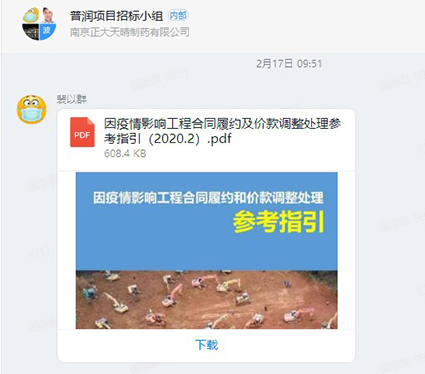 面对疫情下工程项目普遍面临的复工困难、成本增加及工期延误等问题,为避免由此产生的建设工程纠纷,将对公司的负面影响降到最低,公司招标小组全体动员,第一时间系统学习《因疫情影响工程合同履约及价款调整处理参考指引(2020.2)》,并将其与公司相关业务相结合,对相关合同条款进行相应完善和优化,为疫情期间公司工程合同的签订与履约做好充分准备。