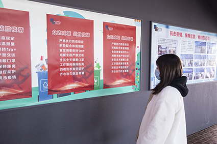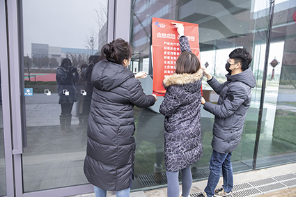 狠抓教育,措施有力。为提高全员防控意识,落实各项防控措施,总经理办公室自2月8日起即开始对恒广路、惠欧路两个园区进行疫情防控布置与每日巡查,会同行政保卫部,通过海报、展板、横幅、视频等方式时时刻刻提醒每位员工认真遵守各项防疫规定,通过明确张贴标识配合空调电梯停用、人行通道关闭、拉开间隔定点就餐等诸多防疫措施落地,据不完全统计在重点区域张贴300余份,将防疫主题与措施渗透到工作场景的所有末梢,进一步夯实防控工作。