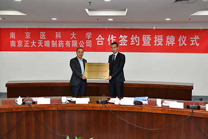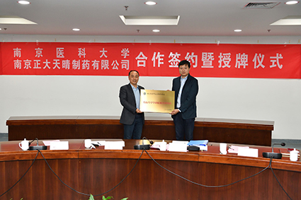 在和谐融洽的氛围中,吕卫东总监与韩峰院长正式签订了战略合作协议,设立南京正大天晴为南医大药学院“临床药学学科联盟”的共建单位、“南京医科大学药学院本科生的科研创新及社会服务实践基地”,授牌仪式随即举行。